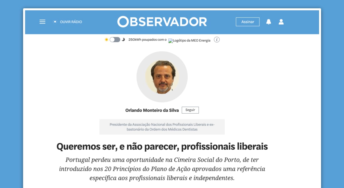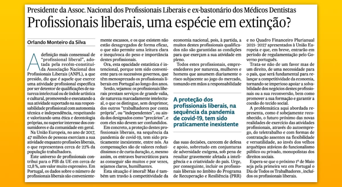 O presidente da ANPL, Orlando Monteiro da Silva, assina esta sexta-feira, 30 de abril, um artigo de opinião que realça a importância de valorizar e proteger os profissionais liberais. A versão completa do artigo está disponível no site do Expresso.